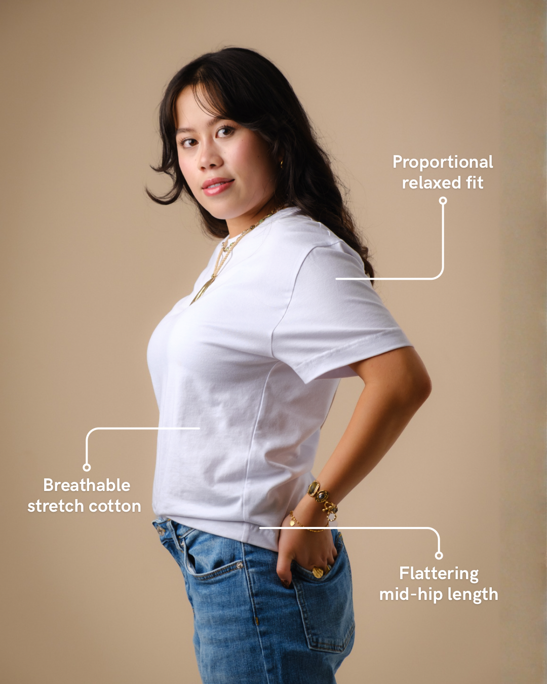 Dropped shoulders and a boxy fit create a laid-back silhouette, while the sleeves are tailored to hit just right—no awkward ¾ lengths. The reinforced neckline and subtle topstitching mean it holds its shape, wash after wash. Falling neatly to mid-hip, CLIO is made to layer or wear solo, always effortless.